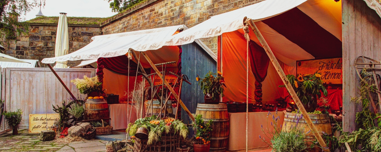 Inmitten des Kasemattenhofes präsentieren Handwerker und Händler ihre Waren und ihr Können und verzaubern mit einem mittelalterlichen Markttreiben, wie es im Buche steht.